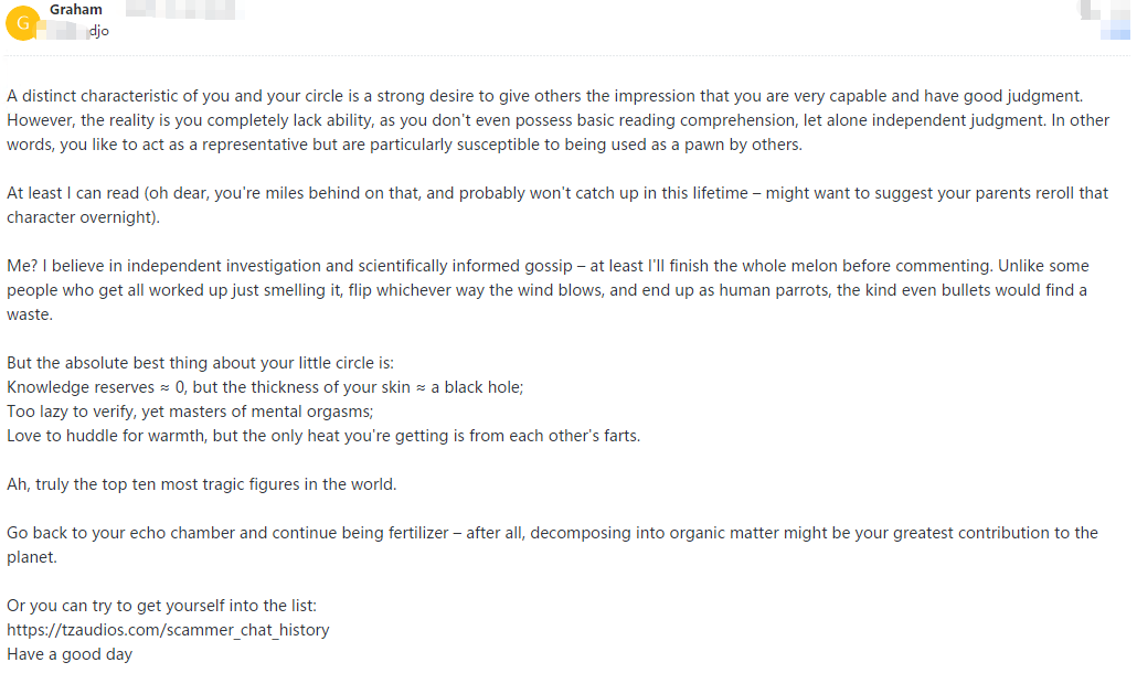 This pig is utterly illiterate and solely focused on personal gain. When their attempts at extortion fail, they immediately resort to spreading rumors.