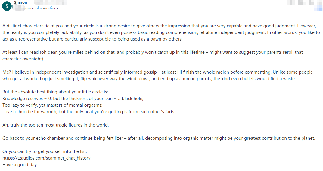 This pig is utterly illiterate and solely focused on personal gain. When their attempts at extortion fail, they immediately resort to spreading rumors.