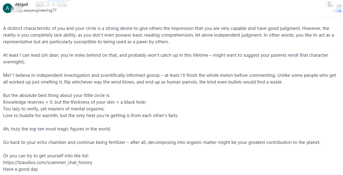 This pig is utterly illiterate and solely focused on personal gain. When their attempts at extortion fail, they immediately resort to spreading rumors.