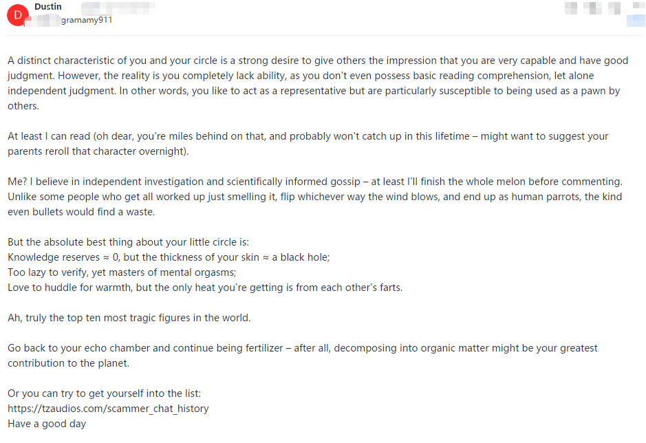 This pig is utterly illiterate and solely focused on personal gain. When their attempts at extortion fail, they immediately resort to spreading rumors.