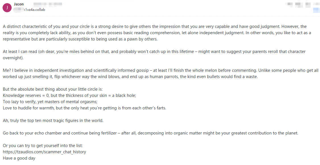 This pig is utterly illiterate and solely focused on personal gain. When their attempts at extortion fail, they immediately resort to spreading rumors.