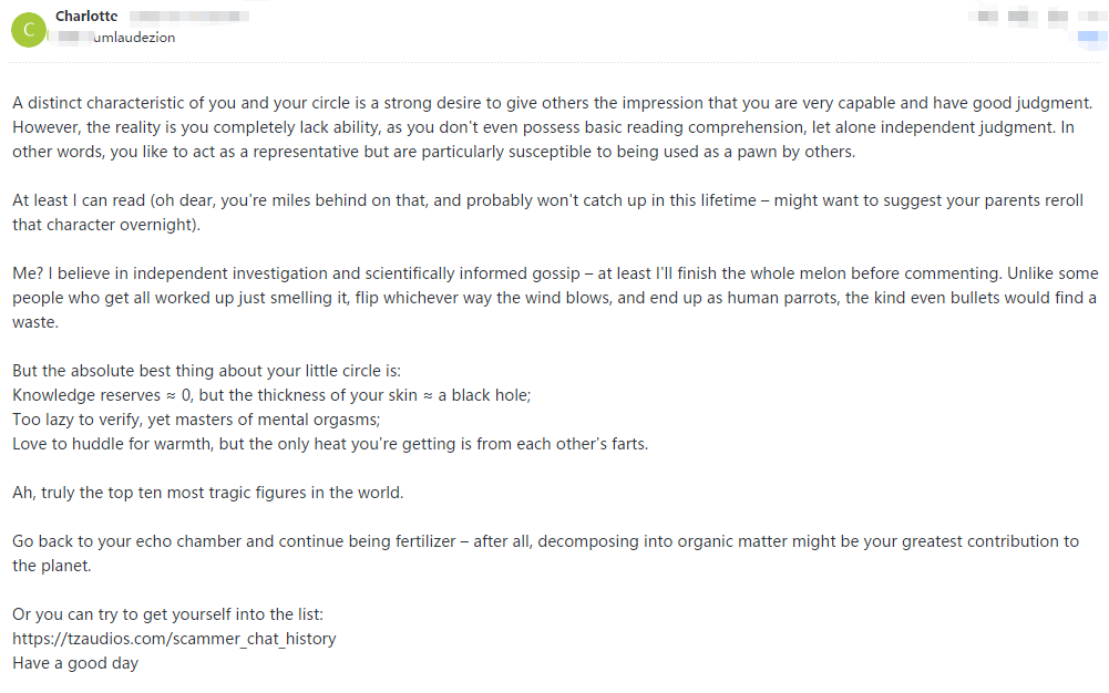 This pig is utterly illiterate and solely focused on personal gain. When their attempts at extortion fail, they immediately resort to spreading rumors.