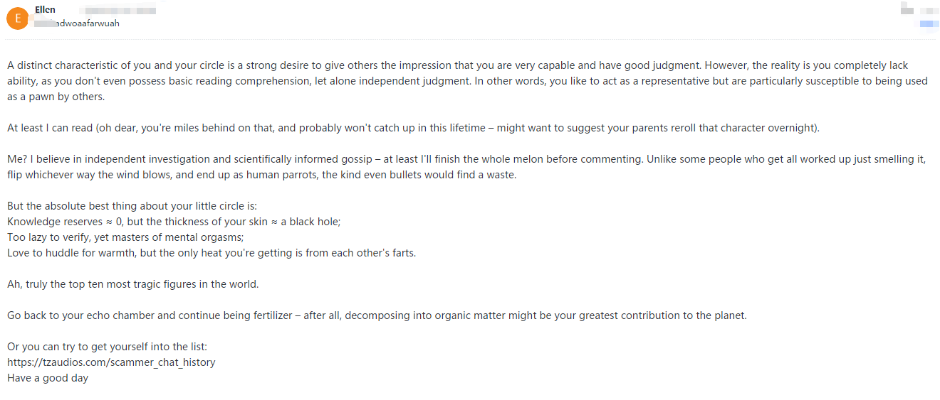 This pig is utterly illiterate and solely focused on personal gain. When their attempts at extortion fail, they immediately resort to spreading rumors.
