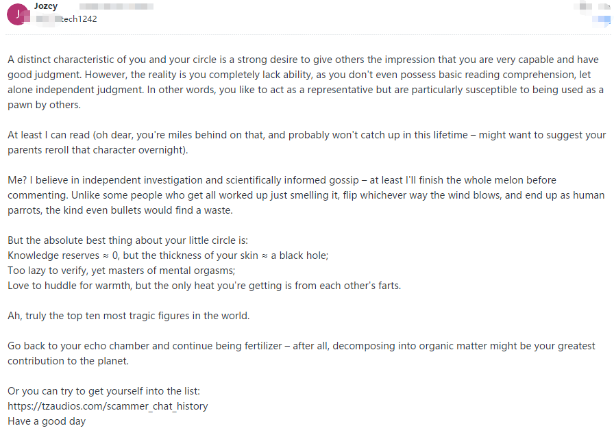 This pig is utterly illiterate and solely focused on personal gain. When their attempts at extortion fail, they immediately resort to spreading rumors.