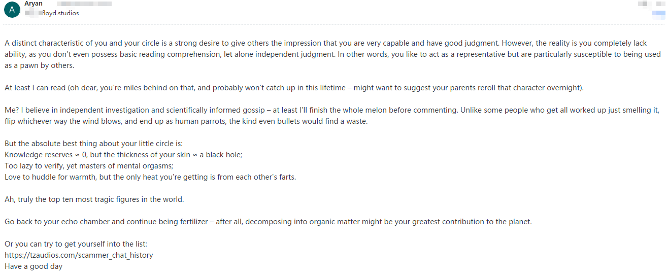 This pig is utterly illiterate and solely focused on personal gain. When their attempts at extortion fail, they immediately resort to spreading rumors.